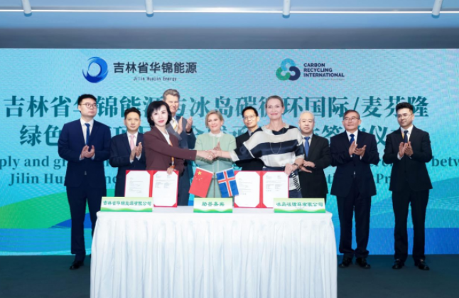 10月16日,正值冰岛总统哈德拉・托马斯多蒂尔访华期间,2025可持续全球领导者大会在上海召开,大会主题活动——中国-冰岛企业合作签约仪式同期举行,冰岛总统哈德拉・托马斯多蒂尔亲临现场。会上,吉林省华锦能源有限公司与冰岛碳循环国际(CRI)/麦芬隆完成绿色甲醇项目暨全球承购合作签约;中环新能源控股集团旗下中环新能源创新研究院有限公司,与吉林省华锦能源有限公司签署战略合作协议。