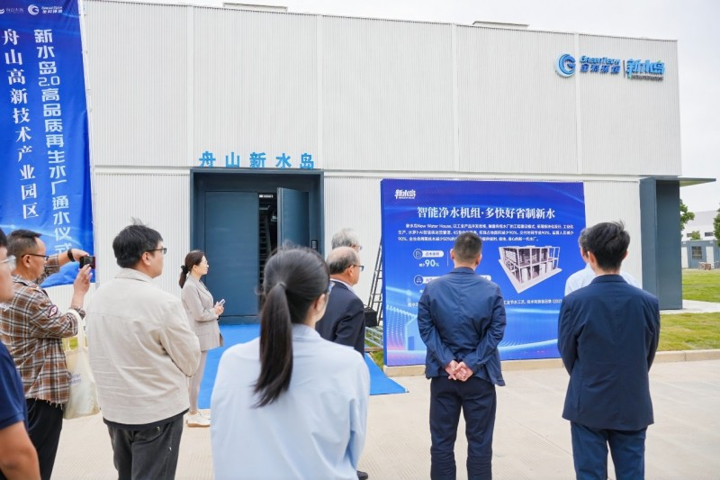 通水仪式结束后,与会人员共同实地考察了新水岛 2.0 水厂。该项目占地面积仅 300 平方米,采用金科环境自主研发的 “新水岛 2.0” 工程模块化产品与 “水萝卜 AI 智能体” 运营管理平台,以污水处理厂出水为水源,通过 “超滤 + 反渗透” 先进处理工艺,使供水水质远超《城市污水再生利用 — 工业用水水质》标准,完全满足国内外光伏企业高标准生产用水需求。项目总设计产水规模达 2 万吨 / 天,其中一期产水规模 5000 吨 / 天,服务范围覆盖舟山高新区内新能源、化工等重点工业企业,目前一期产出的再生水已主要供应园区内光伏企业,为当地新能源产业发展注入了绿色动力。
