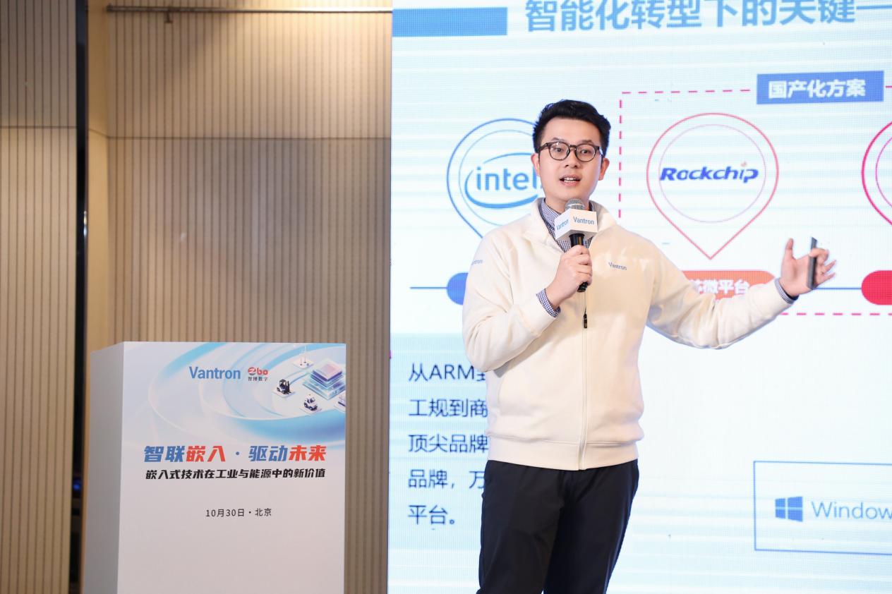 面对信创国产化趋势 ,徐总强调万创在Rockchip、飞腾等多平台硬件与VantronOS国产操作系统上的全面布局。并通过多个案例展示了该矩阵的落地价值:如全国产化设计的可拓展算力网安防火墙、实现高压工业环境数据采集的焊接设备数采网关、集成AI控制与全景监控的EMS储能一体机,以及推动机器人交互变革的现代示教器平板和高性能AGV控制器。