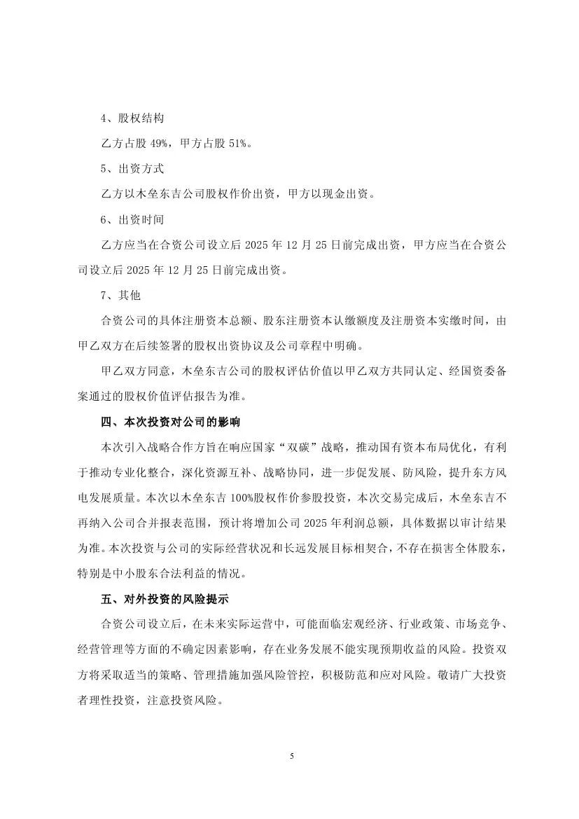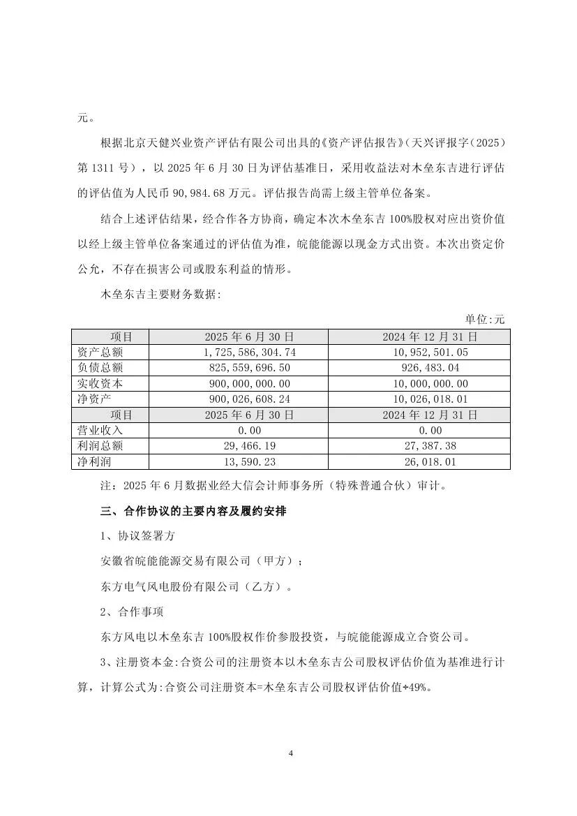 上海油压工作室东方电气控股子公司与皖能能源共同成立合资公司,东方风电持股49%,皖能能源持股51%。合资公司注册资本为:185,683.0205万元,东方风电以木垒东吉新能源有限公司100%股权作价出资,根据北京天健兴业资产评估有限公司出具的资产评估报告,基于评估基准日2025年6月30日,木垒东吉新能源有限公司评估后的股东全部权益价值为90,984.68万元,皖能能源以94,698.3405 万元现金出资。