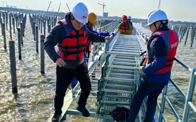 面对潮间带施工困难的情况,林洋新能源建设团队将先筑台、后建站定为首要任务。根据施工规划,两座6400平方米的贝雷结构平台需在1个月内建成,项目组实行设计、施工、监测三班倒机制:技术组白天驻守现场优化钢管桩打入角度,夜晚核算贝雷架承重数据;施工队分成打桩、焊接、防腐三个班组交叉作业,在每日两次潮水退去的间隙抢工。在团队的齐心协作下,直径0.63米的钢管桩群稳稳扎入滩涂,连接平台与海堤的钢栈桥同步贯通,为后续近9万根预制桩、百万块组件的运输安装奠定基础。