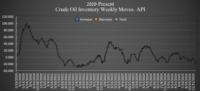 上海油压工作室根据美国石油协会(API)2025年12月30日公布的数据,截至2025年12月26日当周,美国原油库存增加了170万桶,为连续第二周增长。此前一周的库存增幅为240万桶。今年迄今,美国原油库存整体呈现净减少510万桶的趋势。