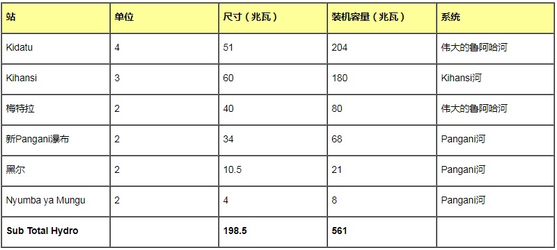 坦桑尼亚估计的总水电潜力为4700兆瓦。到2006年底,安装的水力发电量为561兆瓦。表1列出了现有水电站的清单。