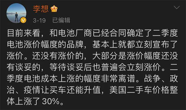 3月19日晚,理想汽车CEO李想在社交媒体上表示,二季度电池成本上涨的幅度非常离谱。和电池厂商已谈妥价格的车企,基本都已宣布涨价,其他车企等谈妥采购价后也将普遍涨价。